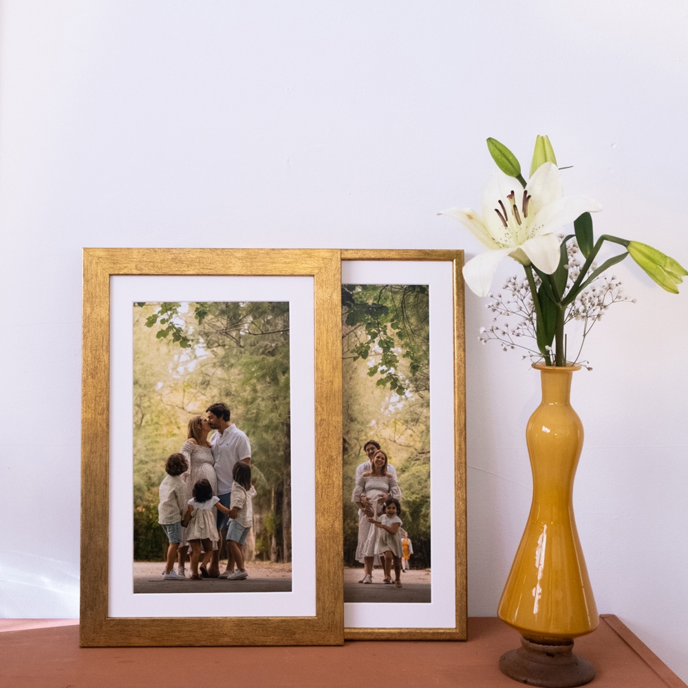 Moldura de alta qualidade,composta por uma estrutura metálica e proteção de vidro, garantindo durabilidade e um acabamento perfeito para destacar as tuas fotos.
