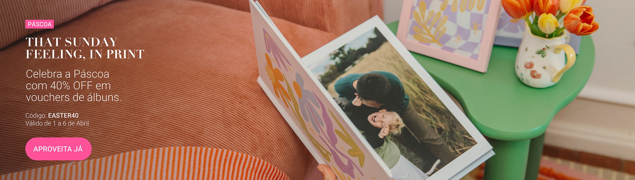 Garante 40% off no teu Álbum de Fotos de Páscoa. Código: EASTER40 . Válido de 1 a 6 de Abril.